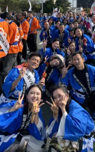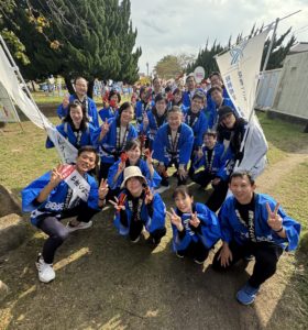 当日は爽やかな秋空のもと、揃いの法被に身を包み、鳴子を手に、宇部市のメインストリート・常盤通りを約30分間、元気いっぱいに踊りきりました。